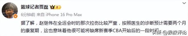 赵继伟在全运会比赛里拉伤退赛,目前还在恢复中,他无缘国家队本窗口期的集训征召,联赛的体测也要因此而推迟。
