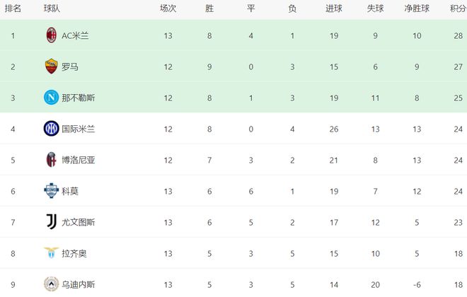 在积分榜上,AC米兰以28分,超越罗马登顶。27分的罗马屈居第2。不过,罗马比AC米兰少赛一场。那不勒斯以25分排名第3。第4的是国际米兰,拿到24分。博洛尼亚和科莫也是24分,排名第5和第6。尤文图斯赢球之后,总积分达到23分,排名第7。前7名的球队差距都很小,最多也就差5分,都有冲击冠军的希望。